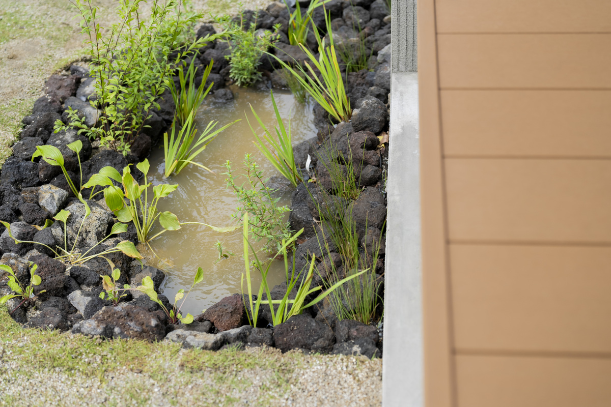 【自然と共に心地よく暮らせる環境づくり】水源涵養(かんよう)を導く「雨庭」や、植物が健やかに成長する土中環境を整える構造を採用しています。