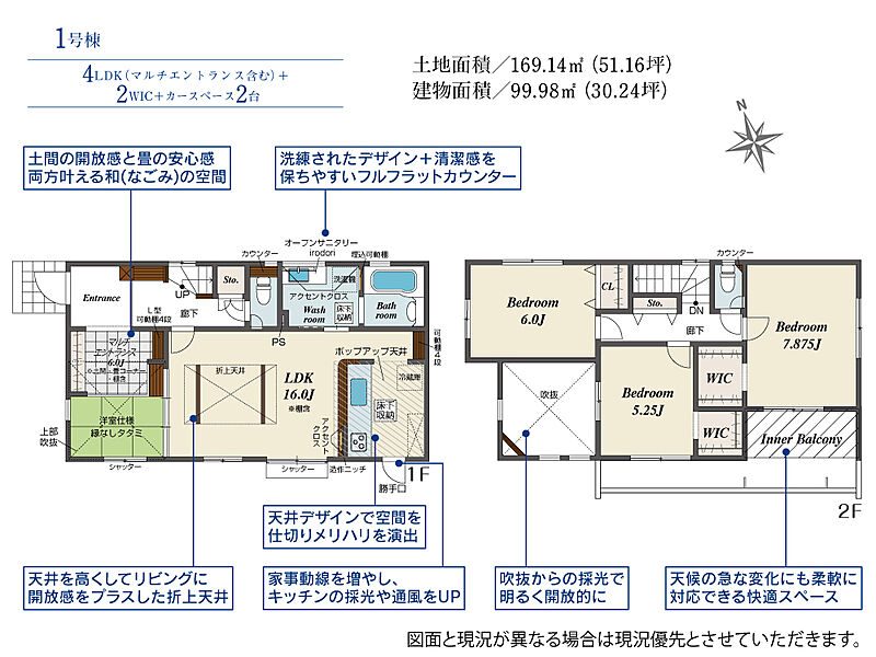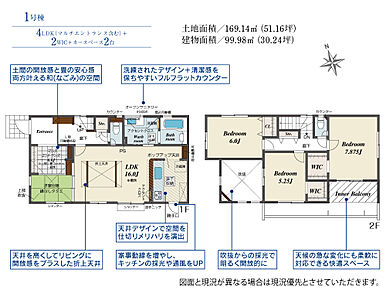 | 建物面積 | 99.98m2(約30.24坪)~101.99m2(約30.85坪) | 土地面積 | 169.14m2(約51.16坪)~185.21m2(約56.02坪) |