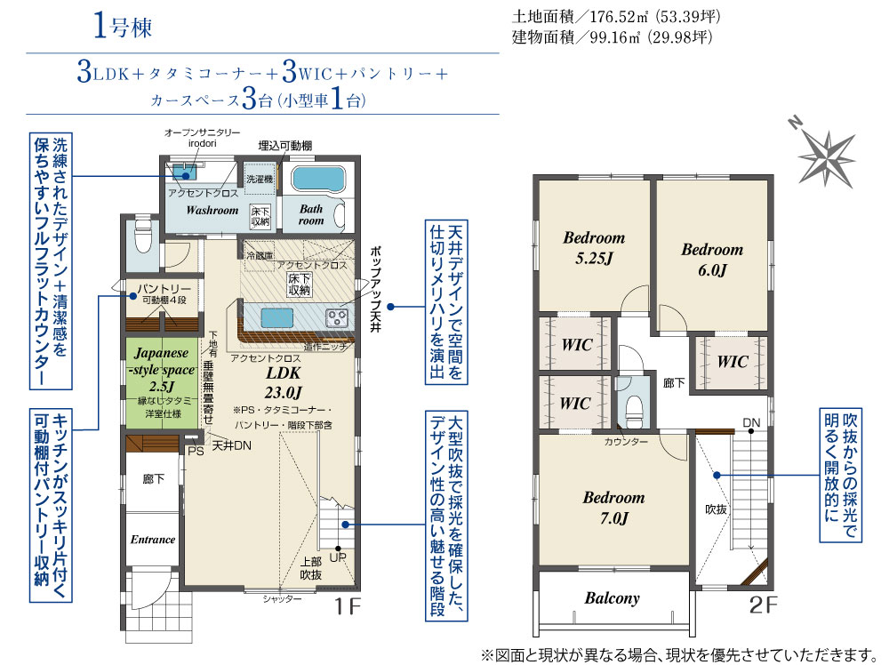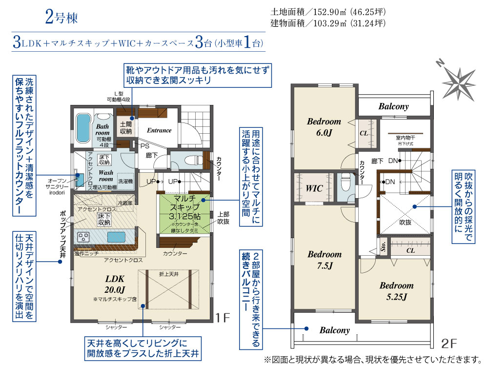 | 建物面積 | 99.16m2(約29.99坪)~103.29m2(約31.24坪) | 土地面積 | 152.90m2(約46.25坪)~176.52m2(約53.39坪) |