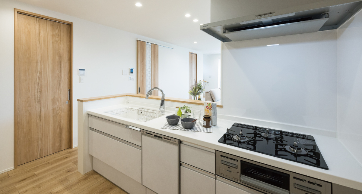 キッチンはホワイトを基調とした、フロアの木目が伸びやかな印象の...