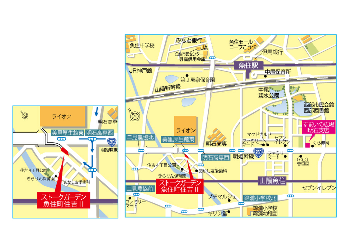 JR「魚住」駅、山陽電鉄「山陽魚住」駅・「東二見」駅の3駅が徒歩圏内にある便利な立地!すぐ近くに明姫幹線が走り、沿線の商業施設利用も◎