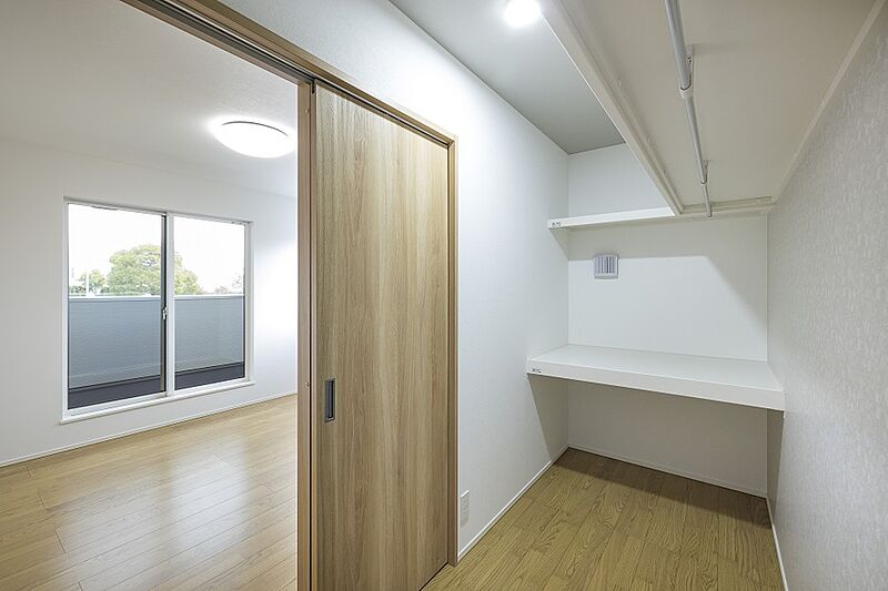 約3帖の大容量WICを設け、タンス要らずで室内広々!バルコニーで乾いた洗濯物を畳まずそのまま収納することができ、スーツケースなどの保管場所としても。