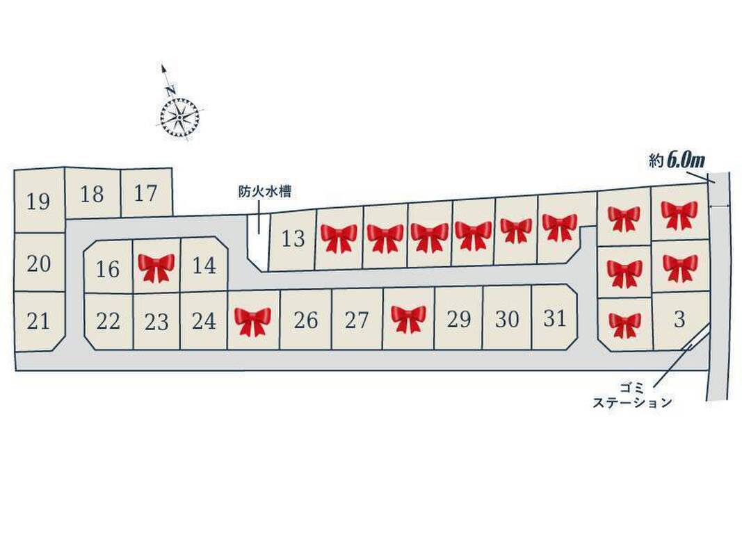 | 駐車場 | 3台 ~ 5台(14号棟:3台 16・31号棟:4台 13号棟:5台 ) | 道路の幅員 | 開発道路(北側6.0m、南側6.0m、東側6.0m、西側6.0m) |