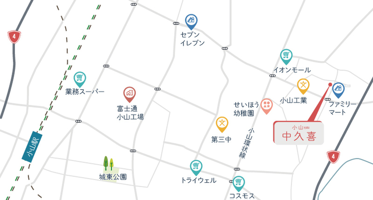 小山市の東部に位置し、周辺は田畑が広がっており、大型店舖など...