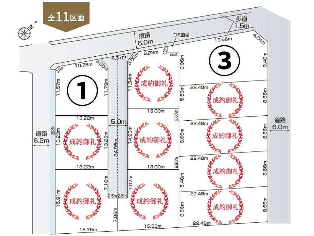 | 駐車場 | 3台 ~ 4台(3台(1号棟)・4台(3号棟)) | 道路の幅員 | 1号棟:角地(北 公道 5.0m 間口 13.3m)(西 公道 8.9m 間口 12.3m) |