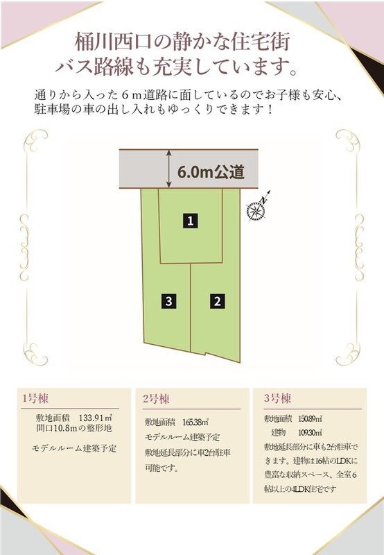 桶川駅から2160m(徒歩27分)、駅西口からは3路線のバスが使えるので便利です。前面道路も大通りから入った通りになるので車通りも少なくお子さんも安心です。