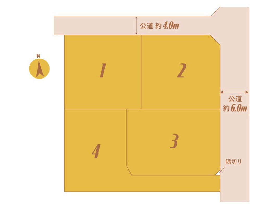 | 駐車場 | 4台 | 道路の幅員 | 2号棟(東 公道 6.0m 間口 13.3m)(北 公道 4.0m 間口 14.4) |