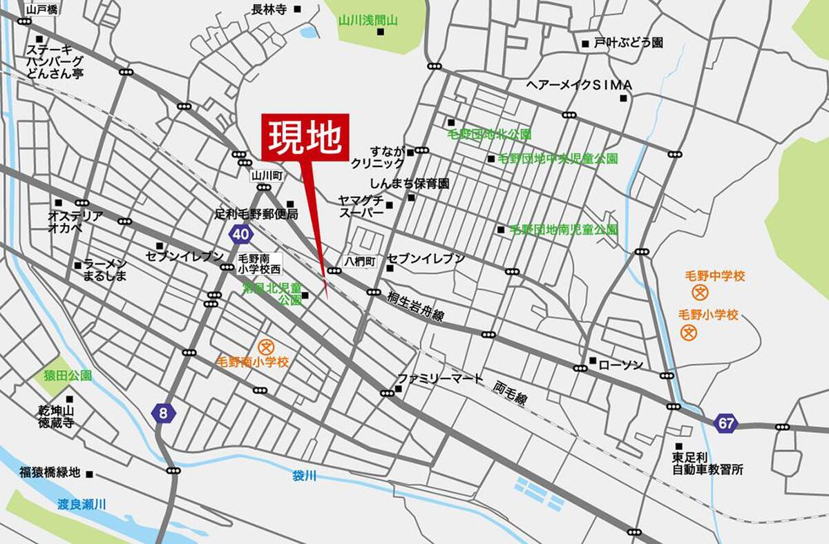 JR両毛線「足利」駅 徒歩42分 JR両毛線「あしかがフラワーパーク」駅 徒歩45分 東武伊勢崎線「東武和泉」駅 徒歩51分~52分 |