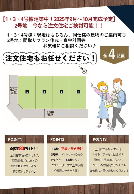 魅力1 全区画80坪以上!並列駐車4台+お庭も広々♪お庭でBBQやプールなど楽しめます♪