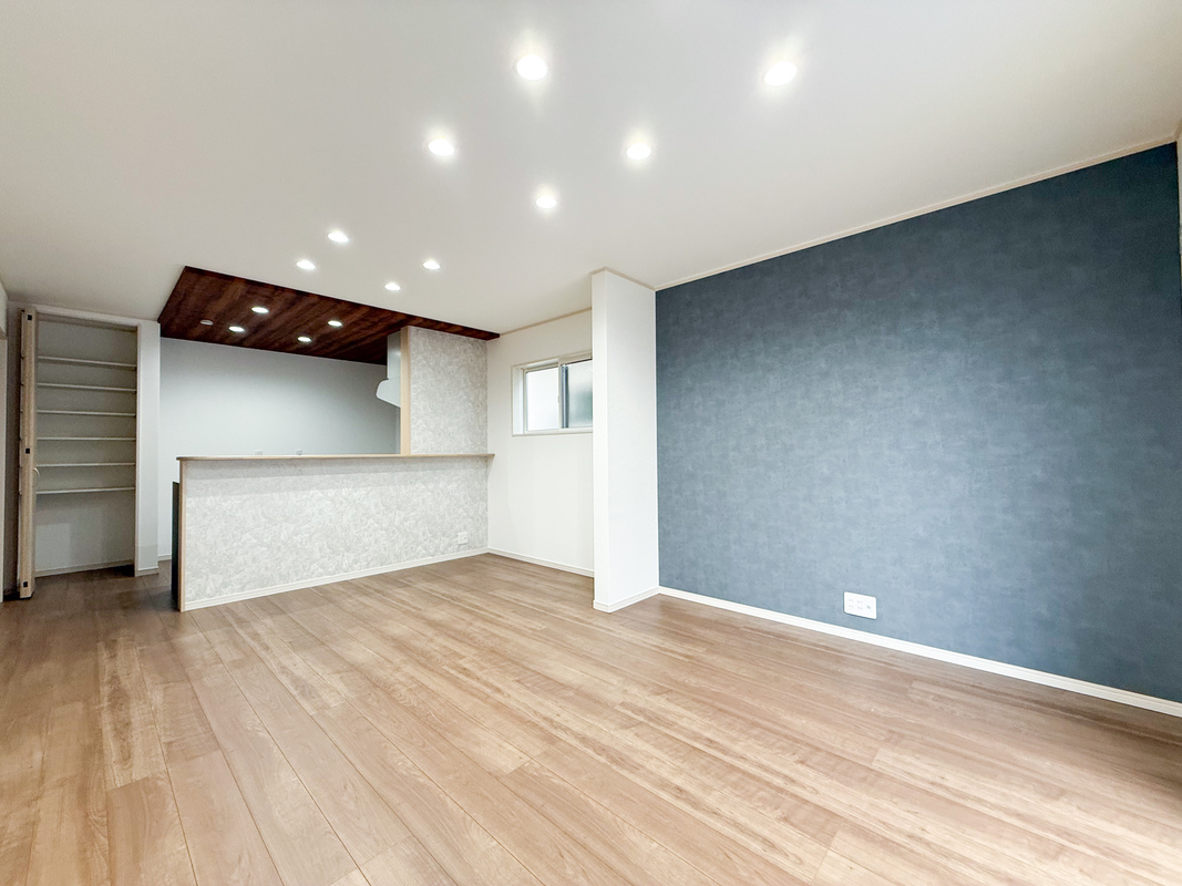 落ち着いたネイビーのアクセントが、家族の時間を彩る15.6帖L...