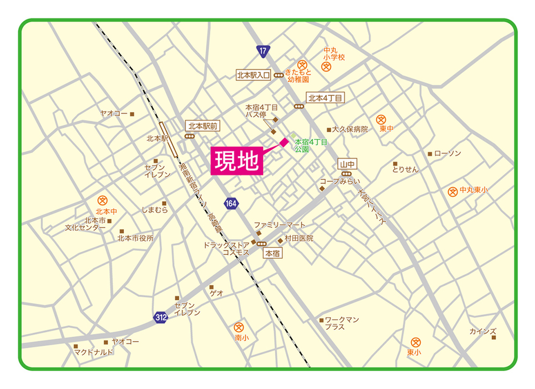 - JR高崎線「北本」駅 ケンちゃんバス(駅東口)より(グリコ先回り)2分乗車 本宿4丁目バス停下車 徒歩3分 徒歩12分~13分
