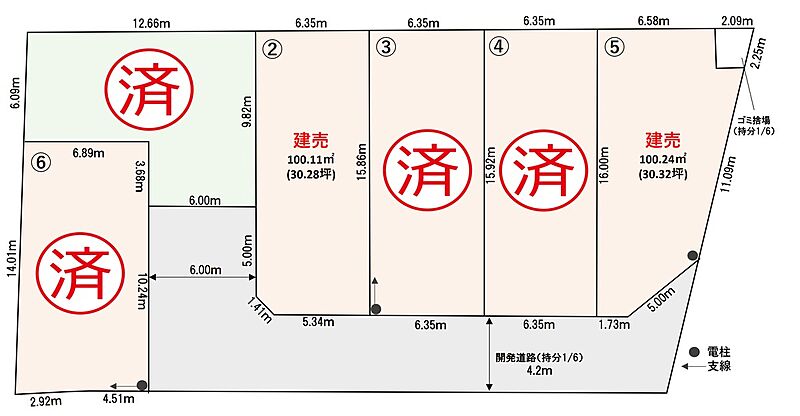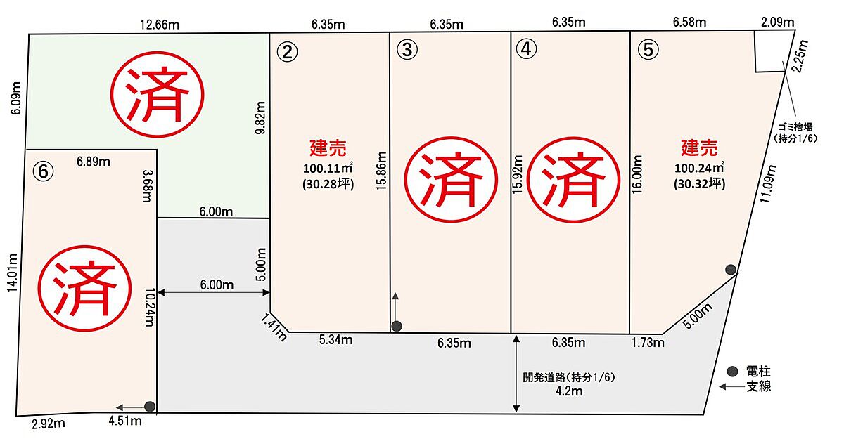 | 駐車場 | 1台 ~ 2台(1台(2号棟)、2台(6号棟)) | 道路の幅員 | 南側4.2m開発道路 |