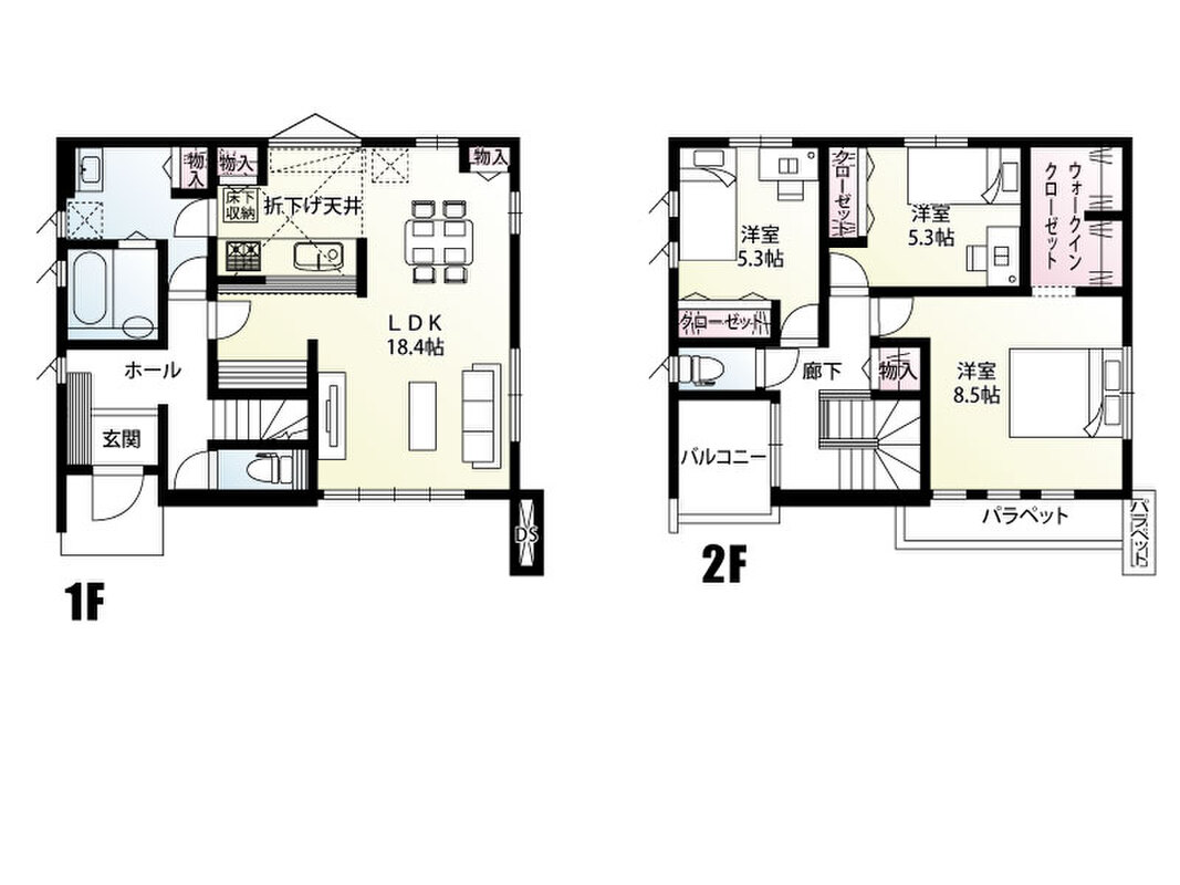 2号棟 間取り 【LDK18.4帖】 価格 3380万円 建物面積 104.13m2(31.49坪) 土地面積 212.34m2(64.23坪) -