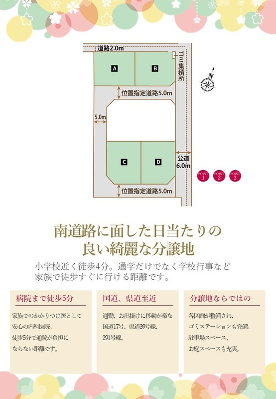 【道路の幅員】 4号棟:角地(南 公道 5.0m 間口 10.1m)(西 公道 5.0m 間口 12.6m) 【その他の法令上の制限】 景観法 ※景観法:高さが15mを超え、または建築面積が1000m2を超える新築改築に対して届出を要します。 都市再生特別地区 ※都市再生特別措置法:都市再生特別措置法による伊勢崎市立地適正化計画について、当物件地は居住誘導区域内及び都市機能誘導区域外に該当致します。 【太陽光について】 4号棟には太陽光発電システムがあらかじめ設置されており、電気の利用に際しては大阪ガス(株)との「スマイルーフ」契約並びに別途定める毎月の電気料金が必要となります。 本サービスは15年間となり、途中解約時には違約金が発生いたします。 ※ご契約の際には「スマイルーフ約款」の内容を必ずご確認下さい。 ■■■>> 新築物件まだまだあります!! <<■■■ ファイブイズホームの公式HPから物件検索してください!! https://www.fiveishome.jp/?link_id=homes ただいま来場予約キャンペーン開催中!! 来場予約で商品券3000円などプレゼント! せっかく見るならこのチャンスをお見逃しなく! http://www.fiveishome.jp/lp/yoyaku/?link_id=homes <お問い合わせに関しまして> ◆しつこい押売り営業はいたしません。安心してお問い合わせください。 ◆物件についてや資金についてなど、どうぞお気軽にご相談ください。スタッフ一同心よりお待ちしております。 ◆お電話の受付時間:午前10時~午後8時[定休日:火曜・水曜(祝日除く)] ※メールでのお問い合わせは24時間受け付けております。 |