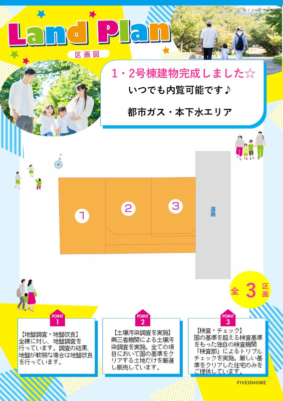 【その他の法令上の制限】 土地面積214.91m2の内、53.06m2は共有地(協定道路)となります。 地役権設定を致します。 ■■■>> 新築物件まだまだあります!! <<■■■ ファイブイズホームの公式HPから物件検索してください!! https://www.fiveishome.jp/?link_id=homes ただいま来場予約キャンペーン開催中!! 来場予約で商品券3000円などプレゼント! せっかく見るならこのチャンスをお見逃しなく! http://www.fiveishome.jp/lp/yoyaku/?link_id=homes <お問い合わせに関しまして> ◆しつこい押売り営業はいたしません。安心してお問い合わせください。 ◆物件についてや資金についてなど、どうぞお気軽にご相談ください。スタッフ一同心よりお待ちしております。 ◆お電話の受付時間:午前10時~午後8時[定休日:火曜・水曜(祝日除く)] ※メールでのお問い合わせは24時間受け付けております。 |