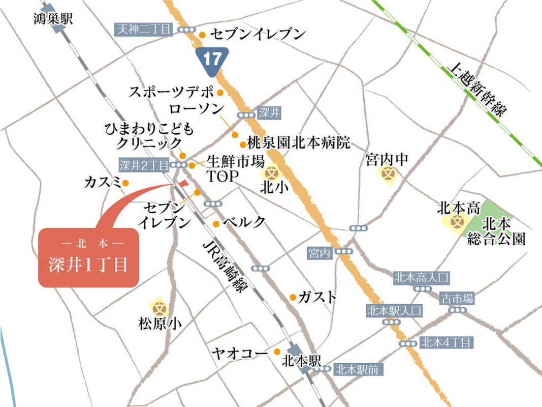 - JR高崎線「北本」駅 丸建つばさ交通 6分 「深井1丁目」 徒歩3分~5分JR高崎線「鴻巣」駅 ロイヤル交通 5分 「人形町」 徒歩7分~8分