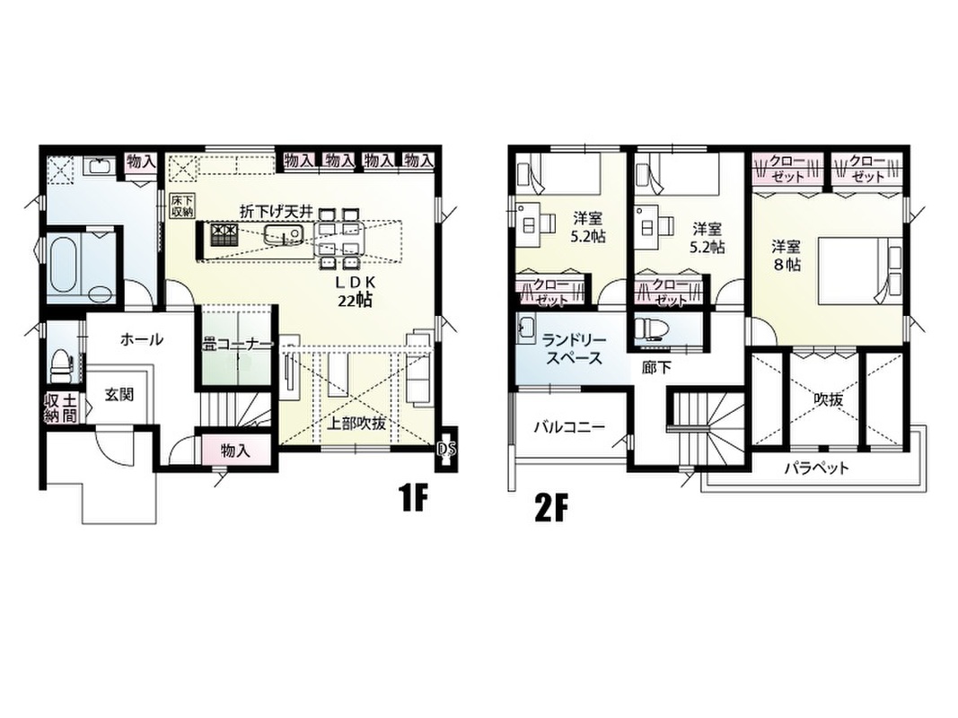■土間収納にはベビーカーやゴルフバックを収納できます■リビング上部吹抜けで開放感たっぷり■水回りがまとまった家事動線■2階ランドリースペースあり■
