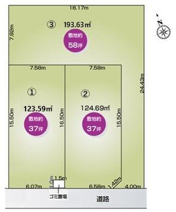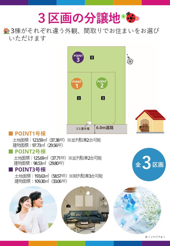 | 駐車場 | 2台 ~ 3台(1・2号棟(2台)、3号棟(3台)) | 道路の幅員 | 1号棟:一方(南西 公道 6.0m 間口 6.0m)他備考欄記載 |