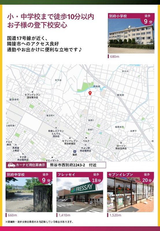 新築一戸建て <熊谷市西別府>小・中学校まで徒歩10分以内、国道17号線に近く通勤やお出かけに便利な立地