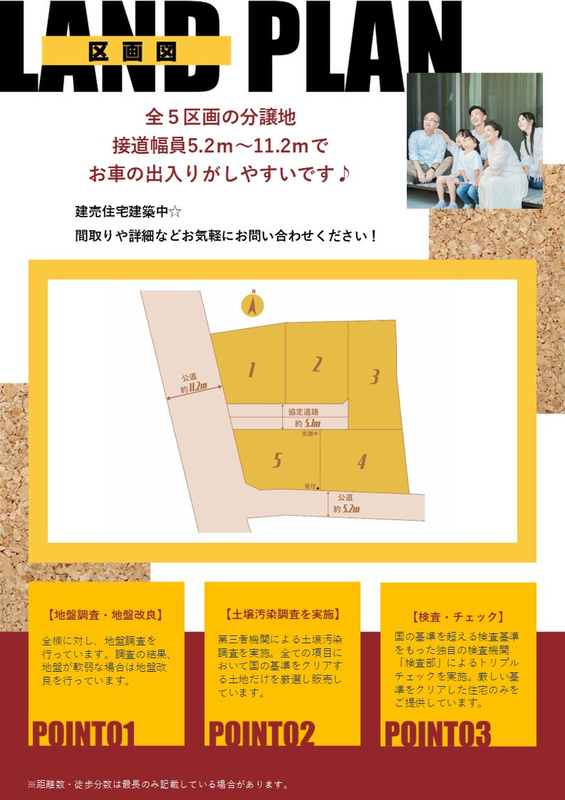 【その他の法令上の制限】 2号棟:土地面積245.85m2の内、58.35m2(持分1/1)は協定道路部分となります。 協定道路部分は地役権設定をします。 3号棟:土地面積253.83m2の内、56.38m2(持分1/1)は協定道路部分となります。 協定道路部分は地役権設定をします。 【地役権】 2号棟:通行地役権 (58.35m2) 3号棟:通行地役権 (56.38m2) ■■■>> 新築物件まだまだあります!! <<■■■ ファイブイズホームの公式HPから物件検索してください!! https://www.fiveishome.jp/?link_id=homes ただいま来場予約キャンペーン開催中!! 来場予約で商品券3000円などプレゼント! せっかく見るならこのチャンスをお見逃しなく! http://www.fiveishome.jp/lp/yoyaku/?link_id=homes <お問い合わせに関しまして> ◆しつこい押売り営業はいたしません。安心してお問い合わせください。 ◆物件についてや資金についてなど、どうぞお気軽にご相談ください。スタッフ一同心よりお待ちしております。 ◆お電話の受付時間:午前10時~午後8時[定休日:火曜・水曜(祝日除く)] ※メールでのお問い合わせは24時間受け付けております。 |