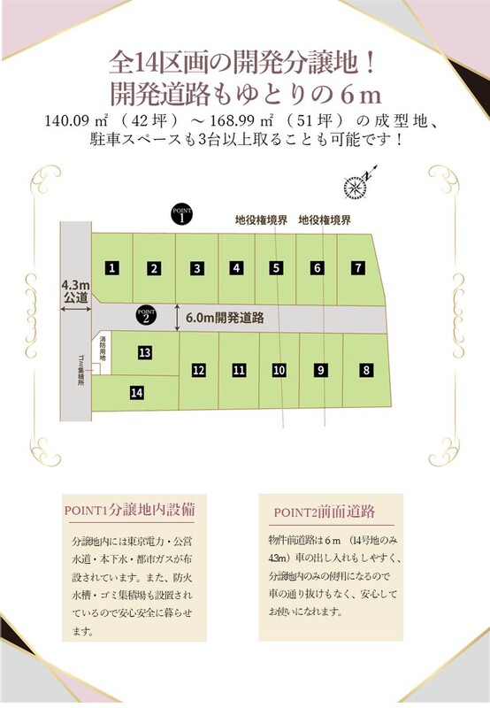 ◆前面道路は6m分譲地内道路なので交通量も少なく安心です。駐車場の出し入れもしやすいです。