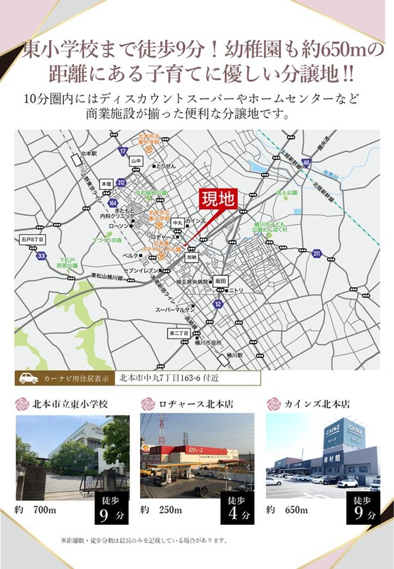 桶川駅・北本駅ともに徒歩35分から36分、両駅からバス乗車10分の2駅利用可能物件。前面道路(6m)も住宅地内なので交通量も少なく安心。幼稚園小学校は徒歩10分以内、スーパーやホームセンターも近く便利