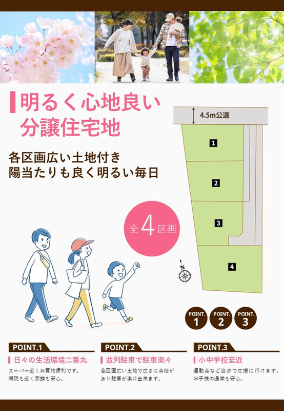 | 駐車場 | 4台 | 道路の幅員 | 3号棟:一方(北 公道 4.5m 間口 2.0m) |