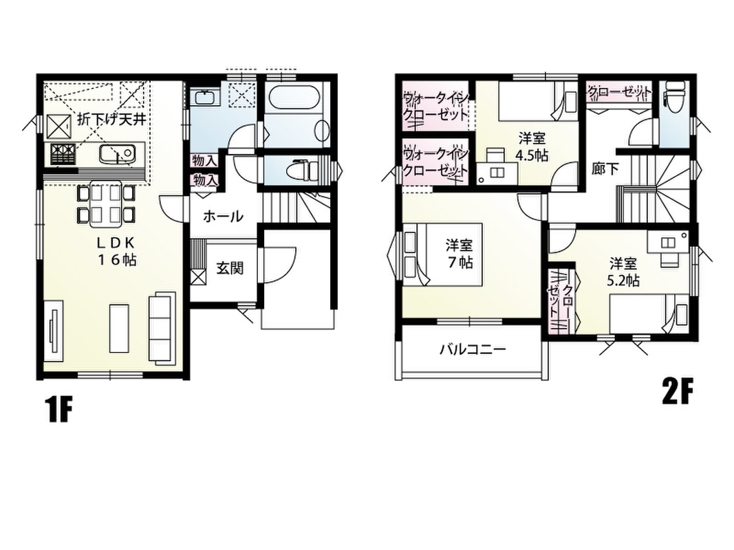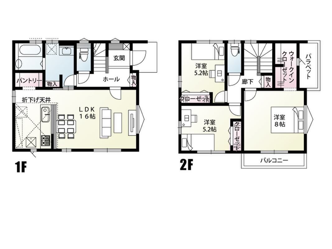 | 建物面積 | 87.77m2(2号棟)~90.67m2(1号棟) | 土地面積 | 141.77m2(2号棟)~155.60m2(1号棟) |