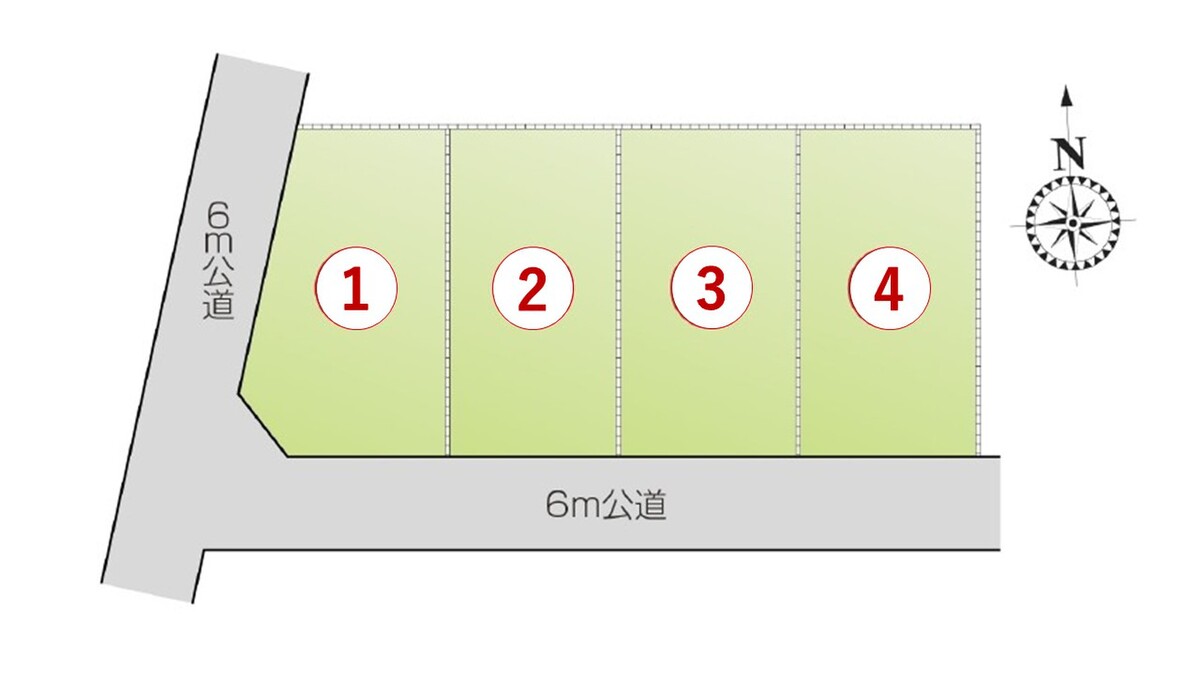 | 駐車場 | 4台(1号棟(4台)) | 道路の幅員 | 1号棟:角地(南 公道6.0m 間口14.7m)(西 公道6.0m 間口16.9m) |