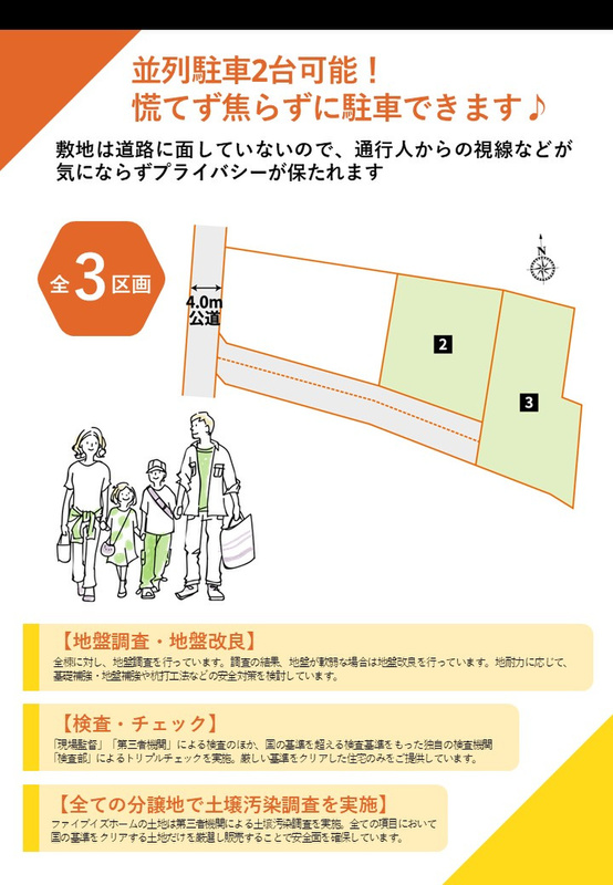 【道路の幅員】 3号棟:一方(西 公道 4.0m 間口 4.3m) 【路地状敷地】 2号棟:117.87m2 3号棟:115.16m2 【その他の法令上の制限】 ・景観法 ・地役権設定あり ■■■>> 新築物件まだまだあります!! <<■■■ ファイブイズホームの公式HPから物件検索してください!! https://www.fiveishome.jp/?link_id=homes ただいま来場予約キャンペーン開催中!! 来場予約で商品券3000円などプレゼント! せっかく見るならこのチャンスをお見逃しなく! http://www.fiveishome.jp/lp/yoyaku/?link_id=homes <お問い合わせに関しまして> ◆しつこい押売り営業はいたしません。安心してお問い合わせください。 ◆物件についてや資金についてなど、どうぞお気軽にご相談ください。スタッフ一同心よりお待ちしております。 ◆お電話の受付時間:午前10時~午後8時[定休日:火曜・水曜(祝日除く)] ※メールでのお問い合わせは24時間受け付けております。 |