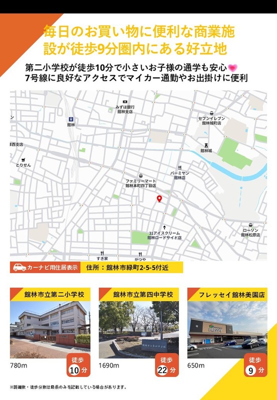 - ※物件から周辺のお店・施設までの距離は、利用が想定される道路を通行した場合の距離です。なお、必ずしも最短距離を保証するものではありません。