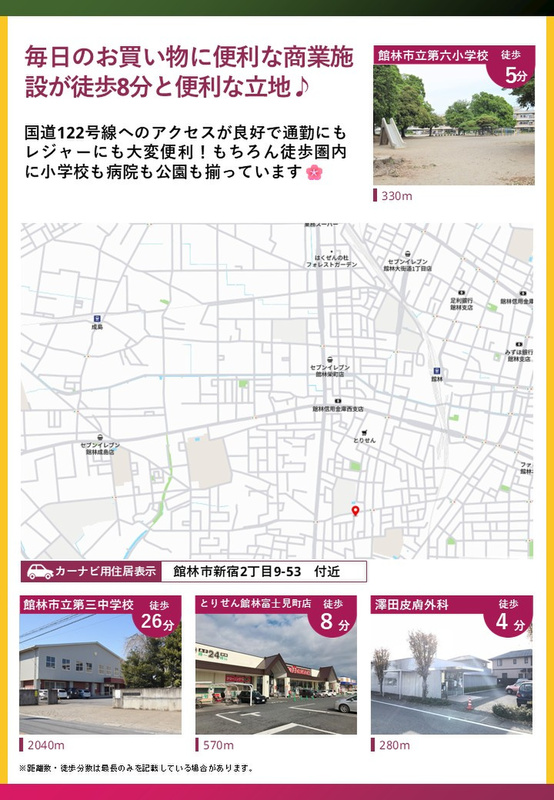 - ※物件から周辺のお店・施設までの距離は、利用が想定される道路を通行した場合の距離です。なお、必ずしも最短距離を保証するものではありません。