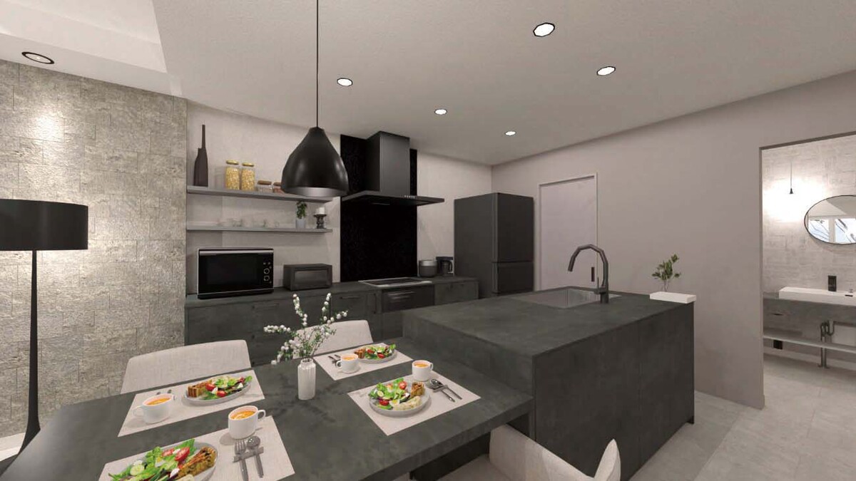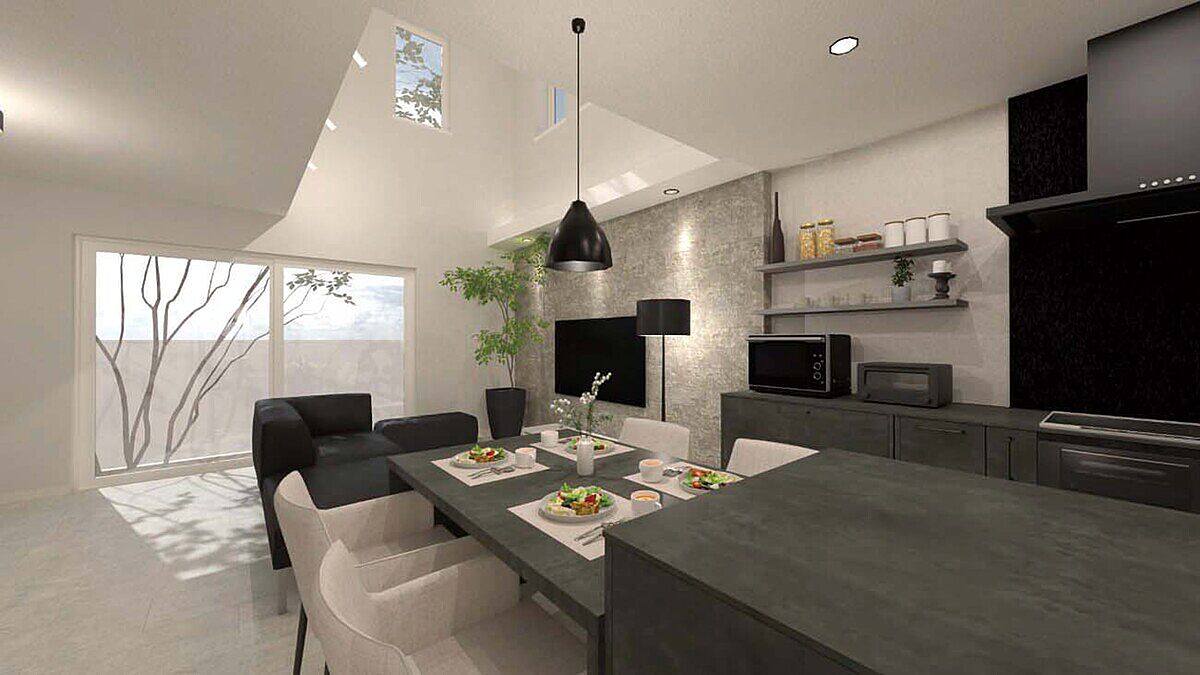白・グレー・ブラックを基調としたシックな内観に、子育て世代にうれしい収納力と家事のしやすさを備えました。 ダイニング一体型のII型グラフテクトキッチンを中心に、毎日の動きがスムーズになる間取りを実現。家族構成の変化にも対応できる3LDKで、長く快適に暮らせる住まいです。
