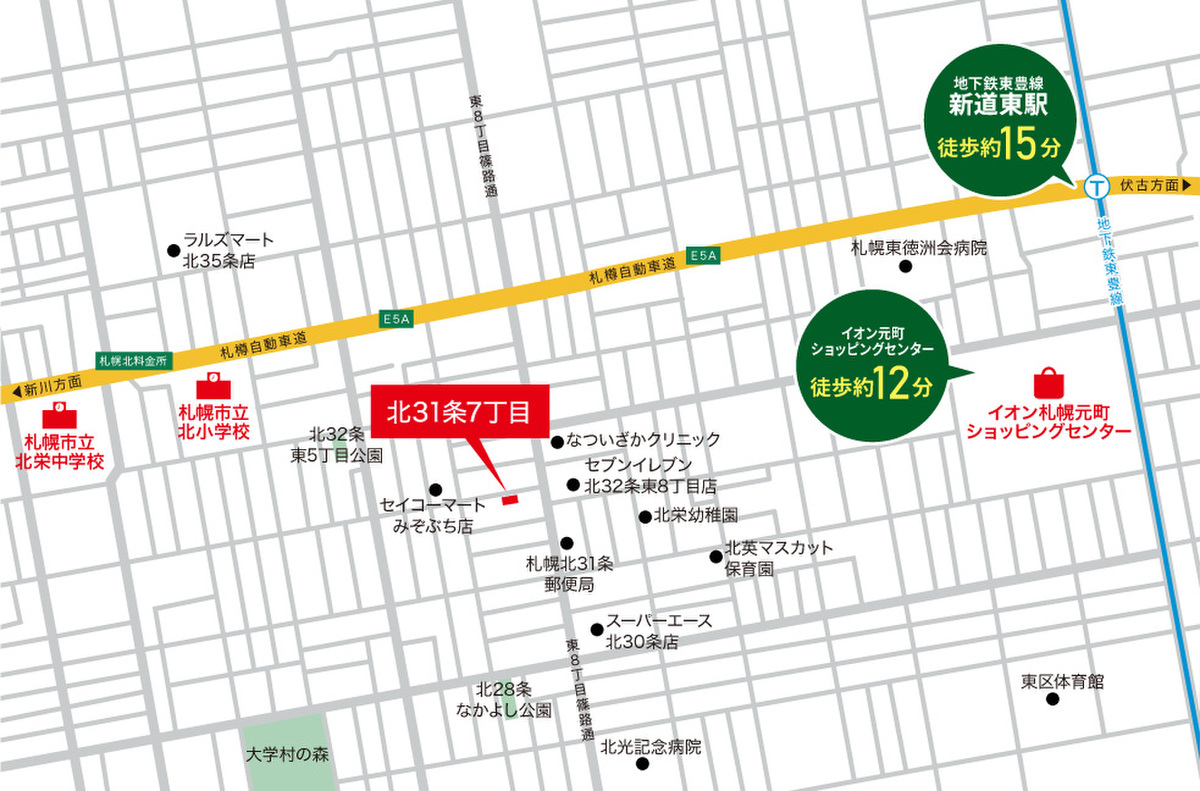 札幌市営東豊線「新道東」駅 徒歩15分 約1200m 中央バス「北33条東8丁目」停 徒歩3分 約220m |