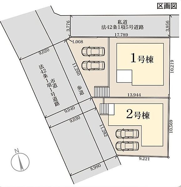 | 建物面積 | 94.39m2・109.30m2 | 土地面積 | 120.61m2・176.85m2 |
