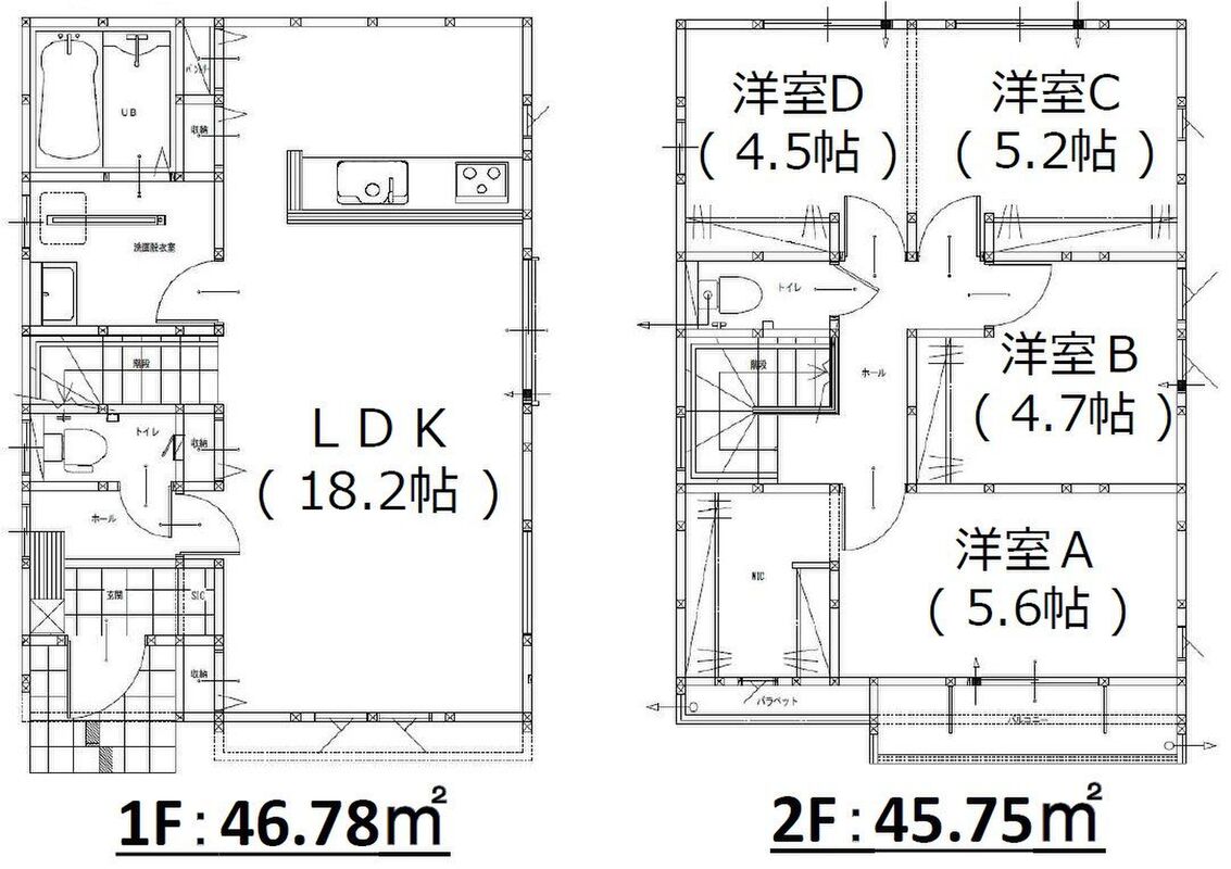 | 建物面積 | 92.53m2・93.12m2 | 土地面積 | 110.80m2・116.58m2 |