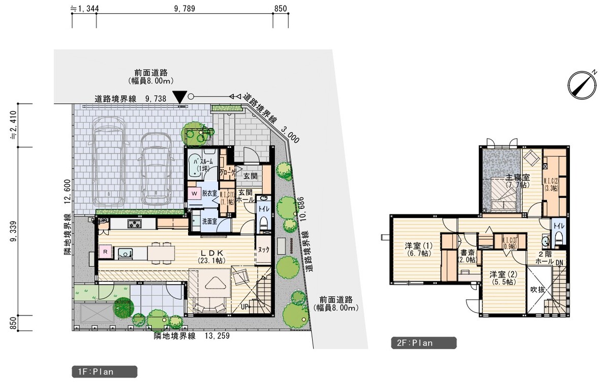 | 建物面積 | 115.73m2(35.00坪)・121.48m2(36.74坪) | 土地面積 | 152.45m2(46.11坪)・155.51m2(47.04坪) |