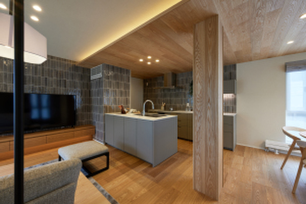 魅力2 和のテイストを取り入れたインテリア。木目天井が一体感を演出します。