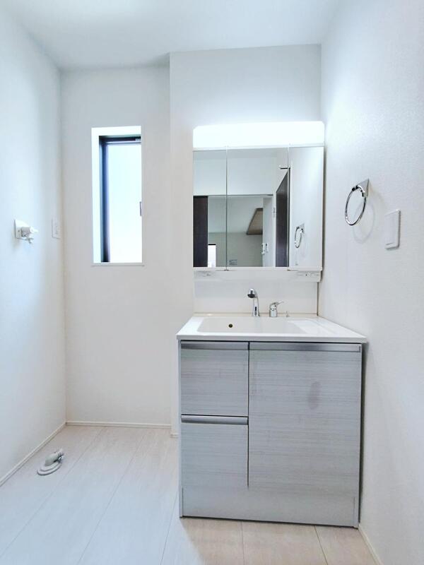 サニタリースペースには窓が備えられております。毎朝の身支度も、陽の光差し込む明るい空間で、快適にお使い頂けそうです。散らかりがちな洗面所も三面鏡うしろの収納でスッキリ!