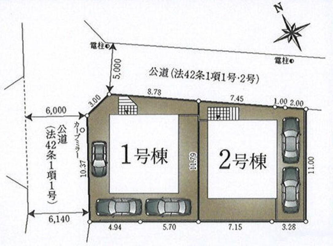 | 駐車場 | 2台 ~ 3台(3台(1号棟)、2台(2号棟)) | 道路の幅員 | 道路幅:5m・6m、アスファルト舗装、北東側公道、北西側公道 |