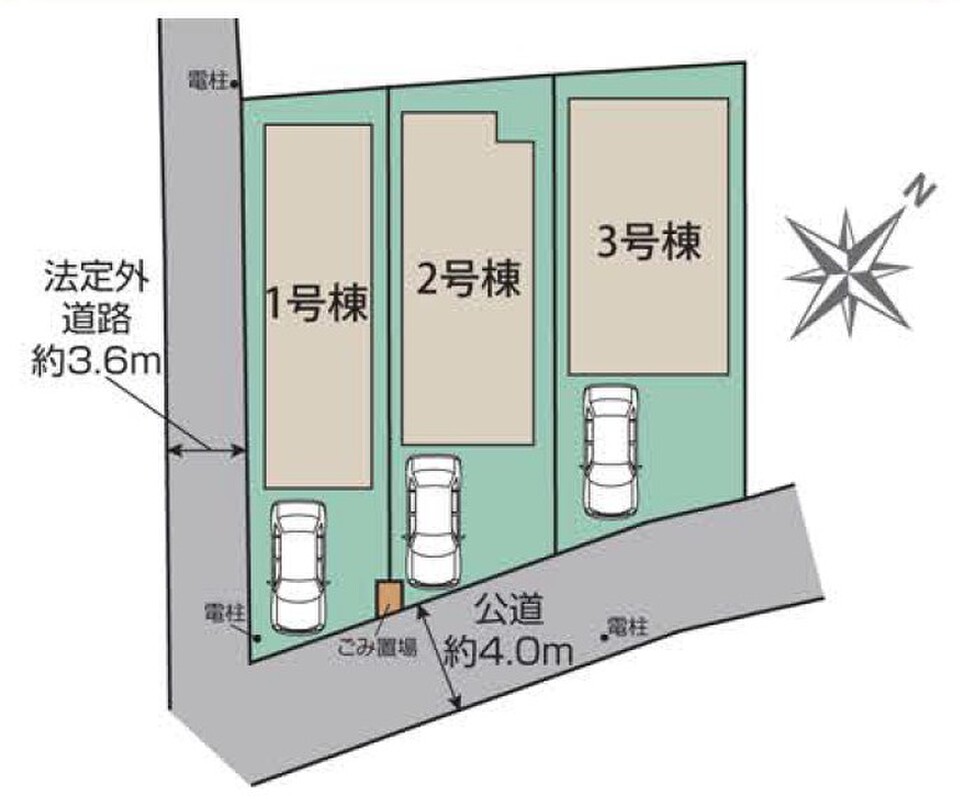 | 駐車場 | 1台 | 道路の幅員 | 南東側約4.0m公道、南西側約3.6m法定外道路 |
