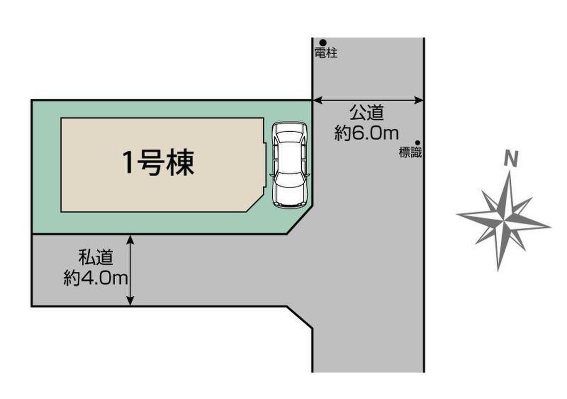 | 駐車場 | 1台 | 道路の幅員 | 道路幅:4m・6m、アスファルト舗装、東側公道、南側私道 ※私道持分有(60.50m2(1/4)) |