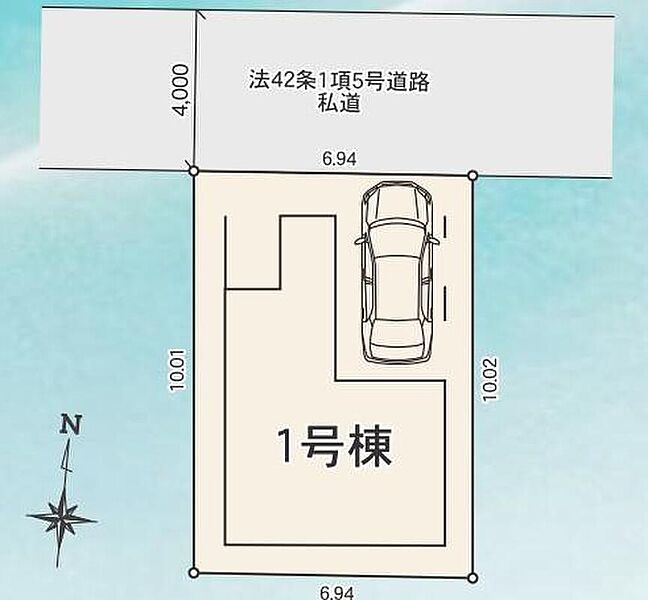 | 駐車場 | 1台(ビルトイン車庫) | 道路の幅員 | 道路幅:4m、アスファルト舗装、北側私道 |