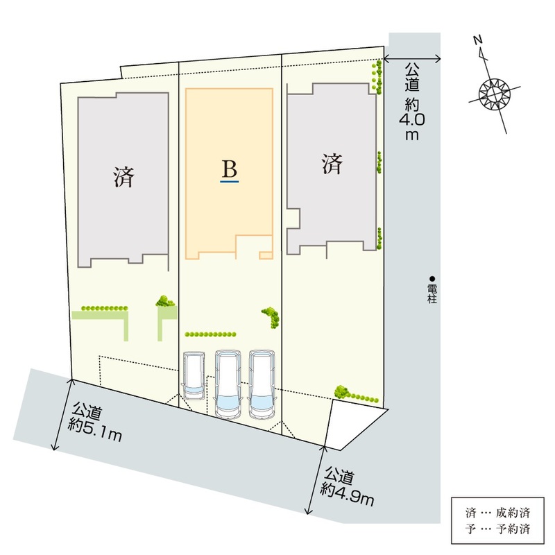 | 駐車場 | 3台 | 道路の幅員 | 南側約4.9m~約5.1m公道 |