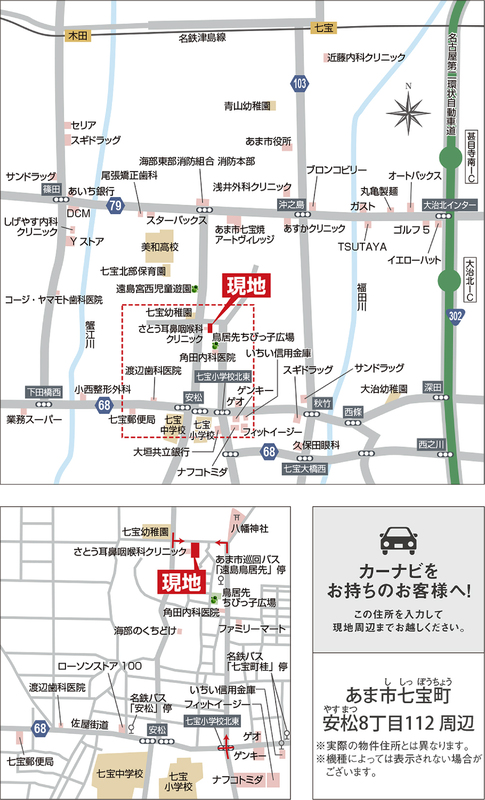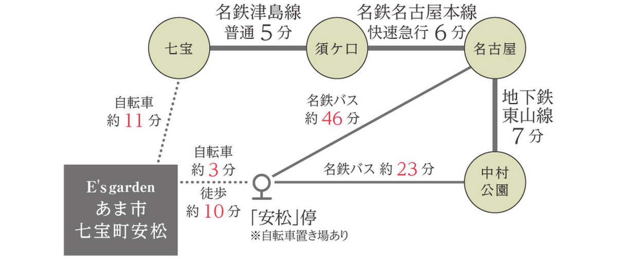 名鉄津島線「七宝」駅 徒歩34分 自転車約11分 名鉄バス「安松」停 徒歩10分 自転車約3分 |