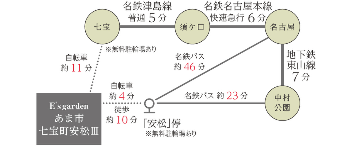 名鉄津島線「七宝」駅 徒歩34分 自転車約11分 名鉄バス「安松」停 徒歩10分 自転車約3分 |