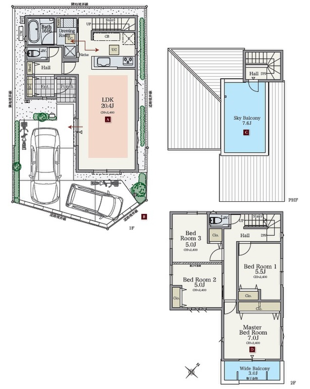魅力1 全邸スカイバルコニー付き、2台駐車可能!