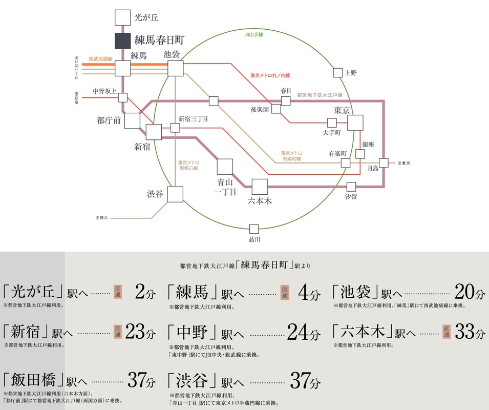 都心へスムーズアクセス!通勤・通学、お出かけが快適!・都営地下鉄大江戸線「練馬春日町」駅 徒歩14分・都営地下鉄大江戸線「光が丘」駅 徒歩17分・西武バス「高松二丁目」バス停まで徒歩4~5分