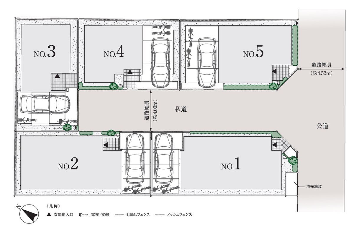 | 駐車場 | 1台 | 道路の幅員 | 南東側4.52m道路 、街区内私道4.00m アスファルト舗装(私道負担88m2の1/5) |