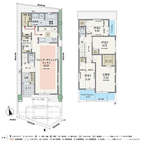 | 建物面積 | 99.57m2(約30.11坪)・100.10m2(約30.28坪) | 土地面積 | 100.68m2(約30.45坪)・100.69m2(約30.45坪)/2号棟建築確認申請面積:100.38m2(約30.36坪) |